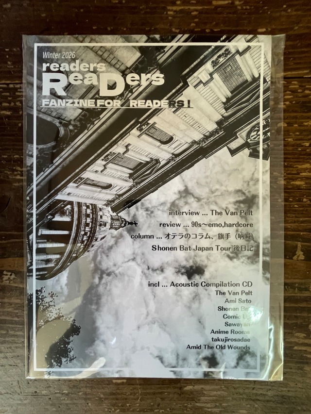 90年代、アメリカのディストリビューターから届いた一冊のZINEに心を撃ち抜かれた記憶は、いまも色褪せない。 ”readers ReaDers” は、ハードコア、エモ、DIYパンクへの個人的な愛情を出発点に生まれ たZINEです。名前も知らなかったバンドのインタビュー、無骨なレイアウト、手触りのある紙。ページをめくるたびに「音楽が遠くの街で鳴っている」感覚を思い出させてくれた、ZINEたちへのオマージュとして創刊。 issue #1 は全24ページのパイロット版。ZINEはNYのThe Van Peltのインタビュー、新潟Oterano Purojectのクサマトモヤ、北海道/室蘭のスクリーモバンド”吶喊”のハタテケイシによるコラム。2024年に行われたスペインのShonen Batのジャパンツアー後記録。90s~の個人的名盤40選のレビュー。Ryan Lewisの日本滞在の記録を残したイラスト。 国内外で活動するバンド/アーティストを集めたコンピレーションCD付き。The Van Peltはドラマーのニールとクリス、そしてクリスの愛娘さんのかわいらしい声が収録されたラフ音源が収録されている。札幌のPlop!のボーカリストAmi Satoのソロ、You Said SomethingのSawayan、東京のシンガーソングライターComic Up、Takujirosadae、スペインのShonen Bat、そのメンバーのJorgeのアコースティックプロジェクトAnime Rooms、そしてドイツのTime As A ColorのオーナーによるAmid The Old Wounds.8バンド13曲を収録 収録曲 1. The Van Pelt ”Lawrence,Kansas” 2. Ami Sato ”ワンダー” 3. Ami Sato ”モラル” 4. Sawayan “Sorry Get Out” 5. Comic Up “日々” 6. Anime Rooms “Adrian,Dani” 7. Anime Rooms “ Oh To Be A Dead Bee Floating Gracefully In A Sit 5ft Deep Swimming Pool Riding The Waves As Children Play Marco Polo Around Me” 8. Shonen Bat “Faint” 9. Shonen Bat “Bridges” 10. Takujirousadae “チャパティ” 11. Takujirousadae “月影” 12. Amid The Old Wounds “More Than A Fortnight(demo” 13. Amid The Old Wounds “There Is Not,And Now We Know(demo)